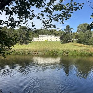 At end of drive, continue along the treeline running parallel to the river and along the backs of the houses. Just before reaching the footbridge over the river, turn right and continue over the mini roundabout then left through the housing estate and onto gravel track.